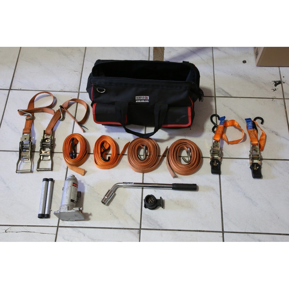 - Součásti vozíku je rezerva – náhradní kolo, nájezdová rampa, přepravní taška ( kurtny – popruhy pro uchycení 1ks motocyklu, nářadí pro výměnu kola, redukce-zásuvka )
